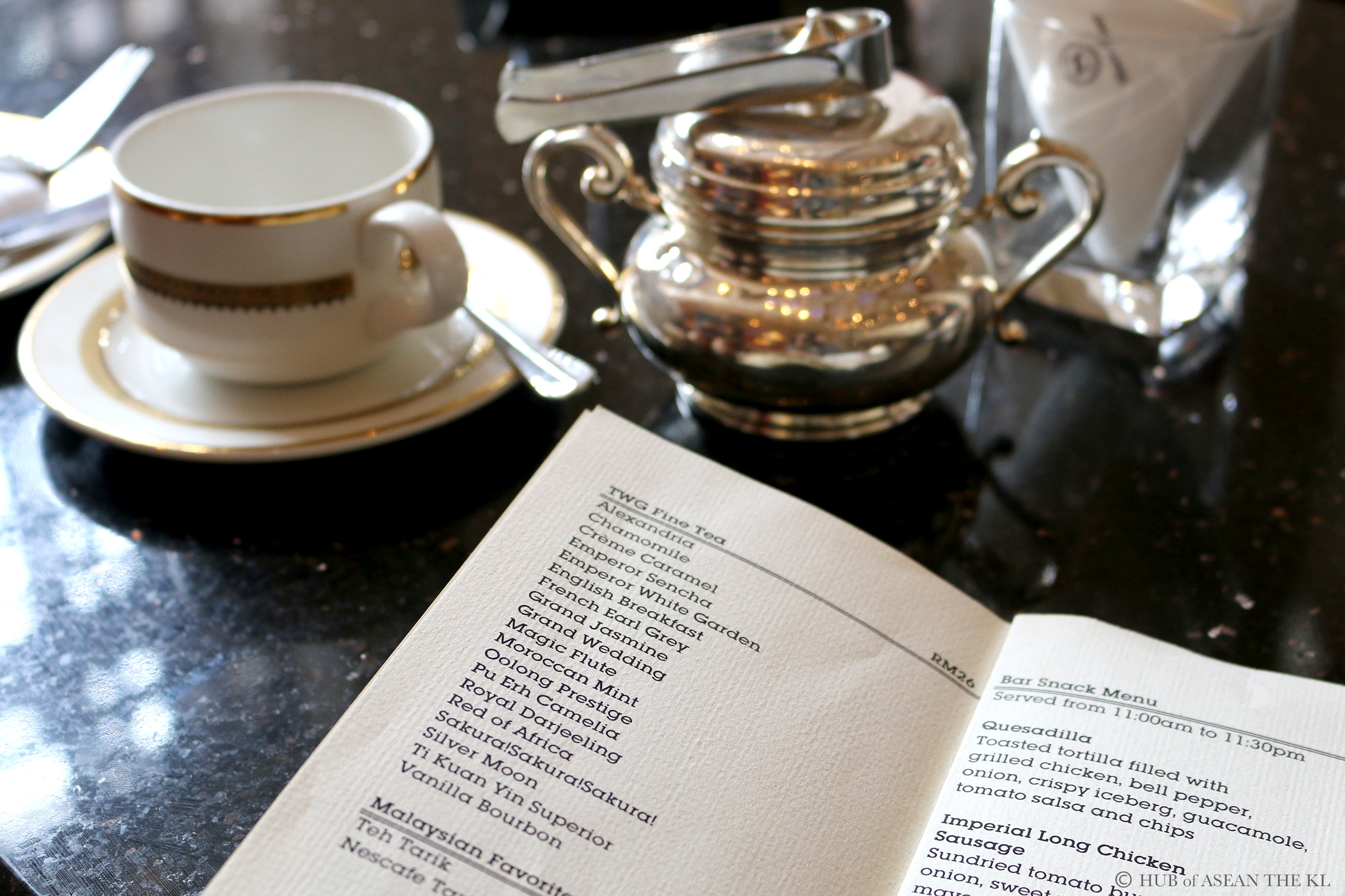ラウンジの奥にはバーカウンターを囲むように喫煙コーナーがあり、ヨーロッパ人カップルやローカル風ビジネスマンがタバコを吸いながらお茶を飲んでいる。5~6メートルしか離れていないのに匂いが全く気にならない。シャンパンでアフタヌーンティーが主流になってきているが、Sheraton Imperial Kuala Lumpur Hotelでは、ラウンジ内のバーで好きなリキュールを頼める。ただし、お酒はセットメニューに含まれない。
